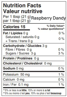 Raspberry Dandy - 41 ml Ingredients: Raspberries, Organic cane sugar, Pure lemon juice, Pectin, Pure vanilla extract, Anise extract, Citric acid