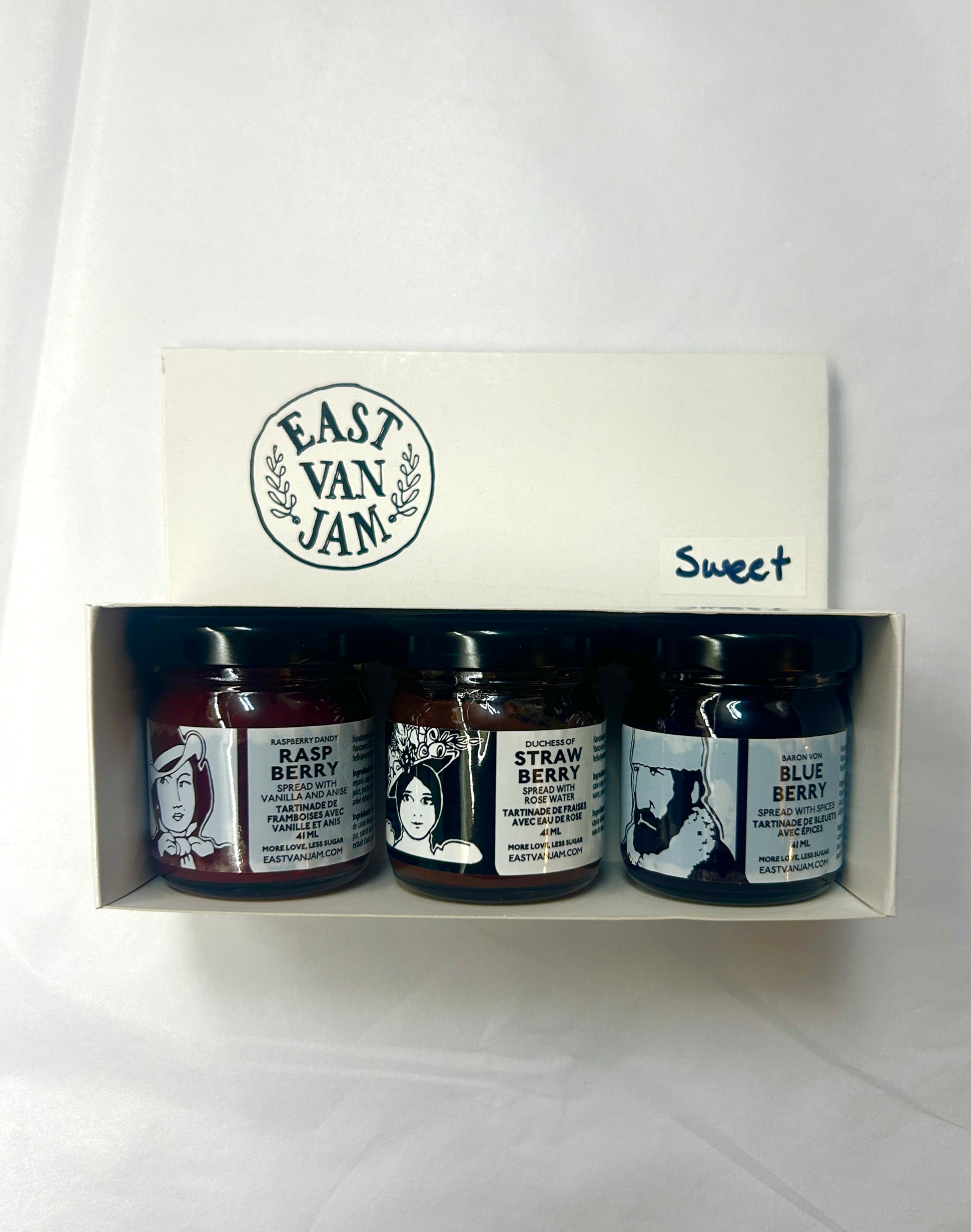 East Van Jam, based out of Vancouver BC, prides themself on their low sugar but high flavour jams. This Trio has small jars of Raspberry Dandy, Duchess of Strawberry, and Baron Von Blueberry jams. This is perfect for a small ice cream bar, gift baskets, or just to sample!