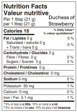 Duchess of Strawberry - 41 ml Ingredients: Strawberries, Organic cane sugar, Pure lemon juice, Rose water, Pectin, Citric acid