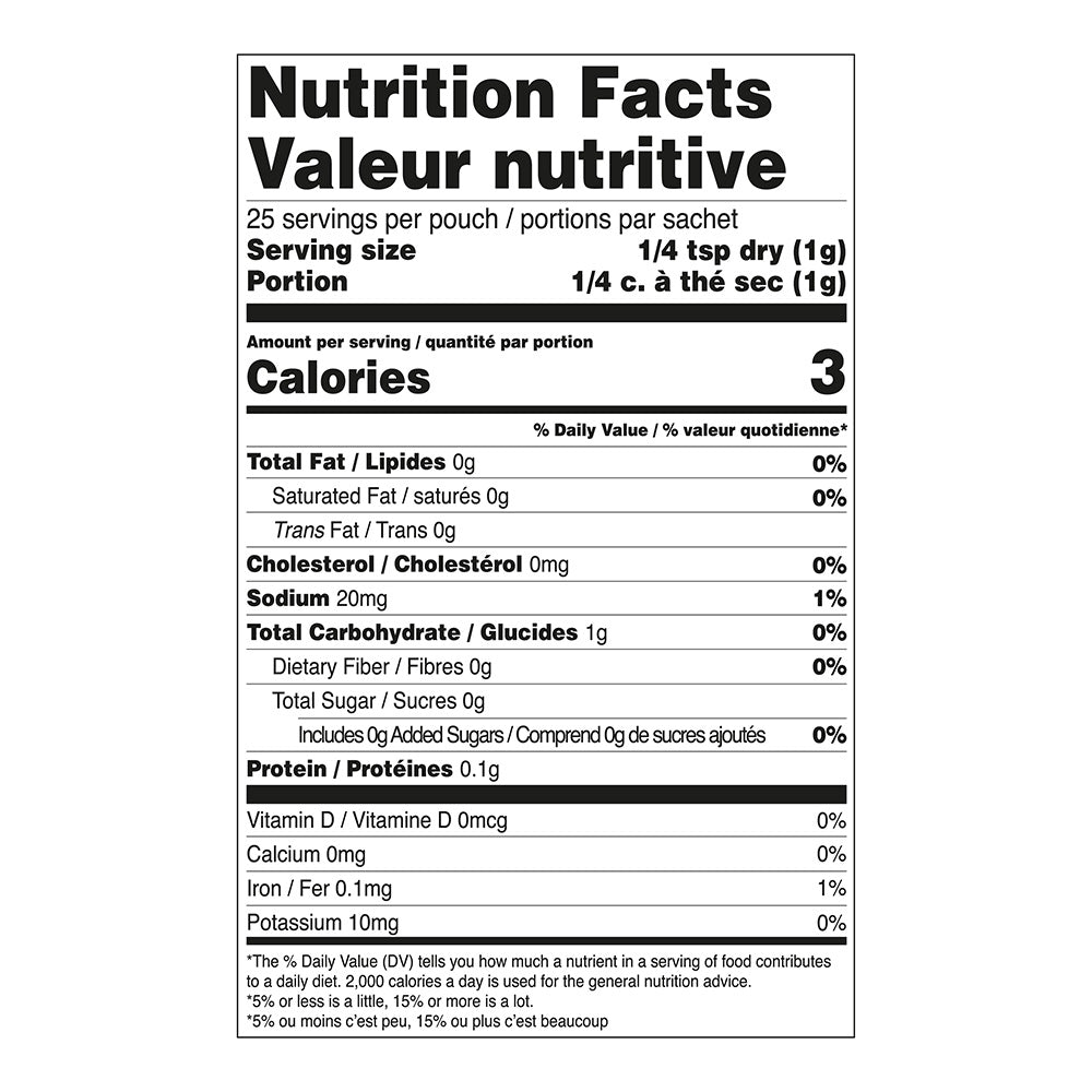 Ingredients: Dehydrated vegetables (onion, tomato, garlic, red & green bell peppers, jalapeno chile), Spices, Sugar, Cocoa powder, Salt, Corn Starch, Silicon dioxide