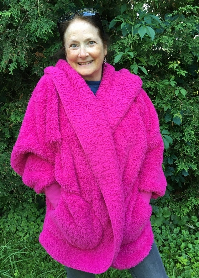 If you like pink you are going to love this new Fuschia Dream'n Nordic Beach Body Wrap. This warm, comfy wrap will keep you cozy and looking good at the same time. It is incredibly warm with sleeves, a hood and pockets. It feels like being wrapped in the comfort of a blanket. Nordic Beach Body Wraps are comfortable to wear any time of year but exceptionally shine in the months where it is warm in the day and dips to cooler temperatures in the evening. It also makes the perfect "sweater" to keep you warm on the couch reading or watching T.V. All Nordic Beach Body Wraps come in a zippered carry bag. One size fits all.