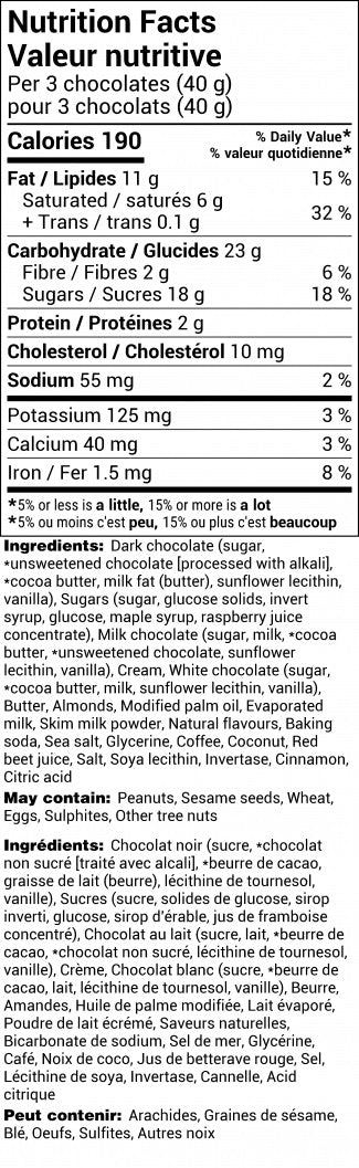 This delectable sampling of Rogers legendary chocolates includes a butter cream caramel, a crunchy butter crunch, a couple of truffles and a selection of their famous victoria creams. 8 pieces in milk and dark chocolate. A perfect Sampler to share - or not!