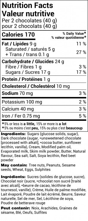 This sleeve comes with 4 pieces of smooth and chewy vanilla caramel covered in dark chocolate and sprinkled with pink or white sea salt. The perfect balance of sweet and salty! Perfect to share or have all to yourself!