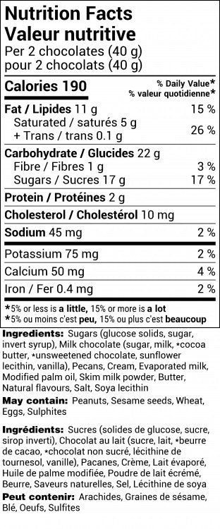 Pecan Chews Caramels - Milk Chocolate - 4 squares - sleeve pkg - Rogers Chocolates